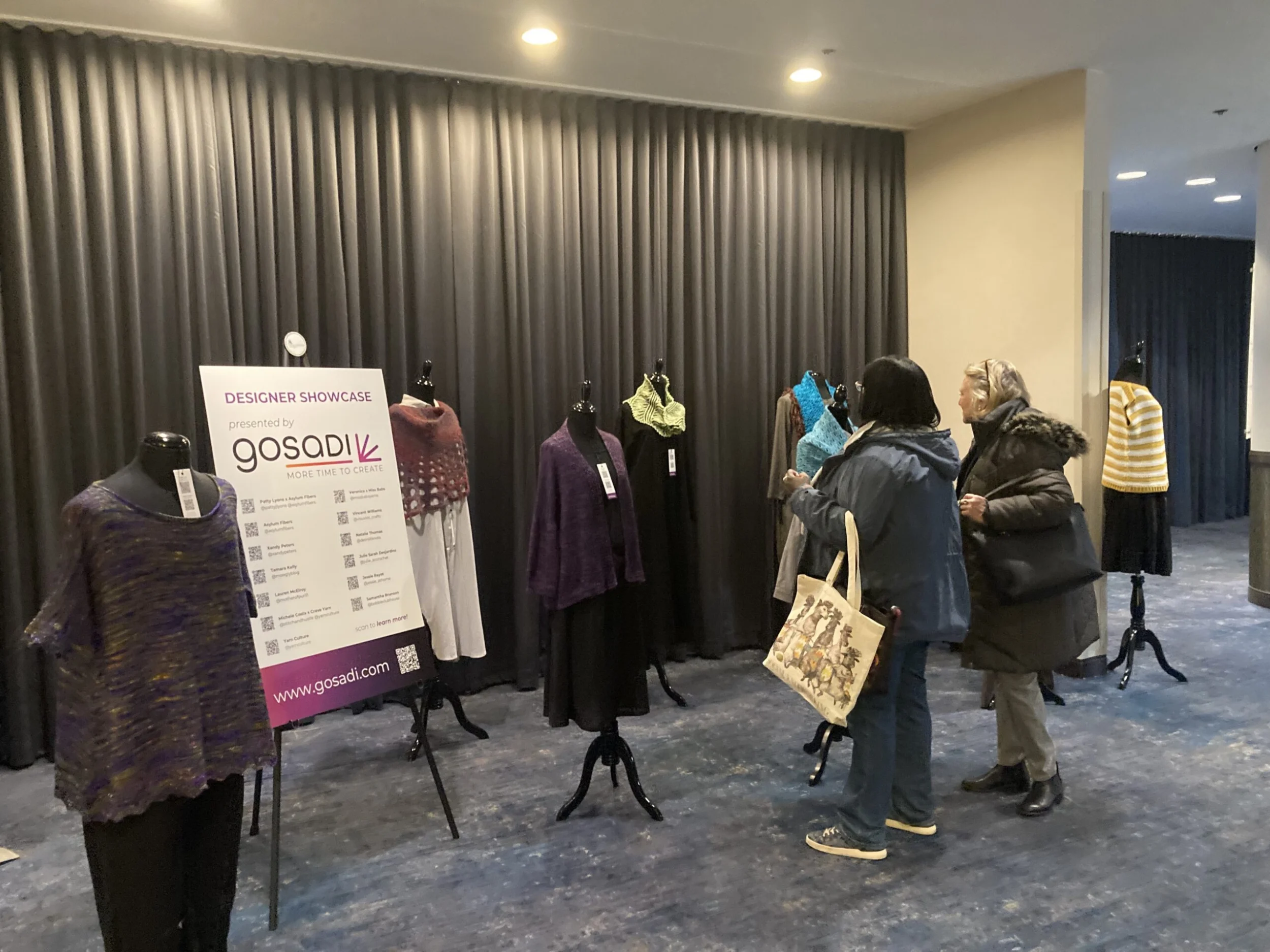 Each featured design hung on mannequins along with scannable QR codes which allowed guests to instantly explore the patterns they love before heading to the show floor to pick up the required yarns and shop vendors. The talented featured designers are all Early Access users of the gosadi platform! Because not only is gosadi is built for designers, publishers and creators who want to spend less time on e-commerce backend busy work, but we are here to elevate and celebrate our design community. These showcases allow us to do just that!