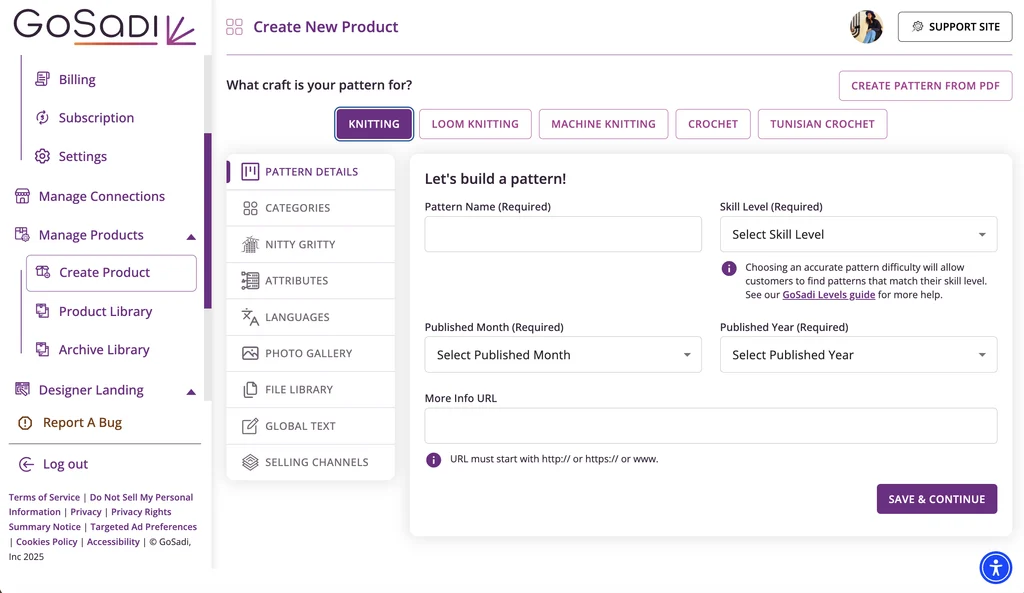 Learn how to create a new product on GoSadi. You’ll enter pattern details, write compelling descriptions, and add high-quality photos that showcase your design.